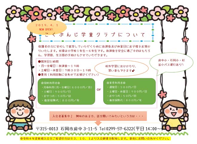 平成31年4月、国分寺幼稚園付属こくぶんじ学童クラブがオープン